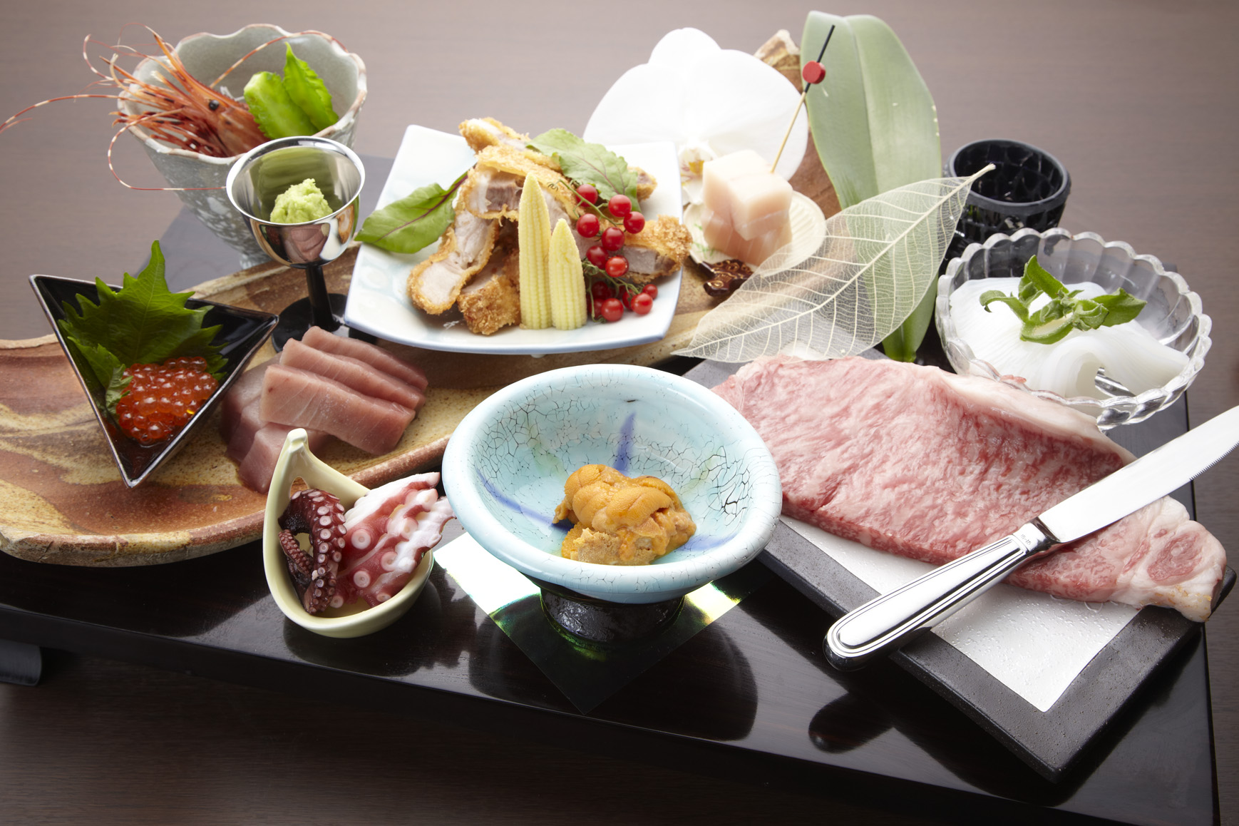 - 前菜・造り・和牛炙り生ウニ巻き・天麩羅七品・白飯・椀・香の物・デザート